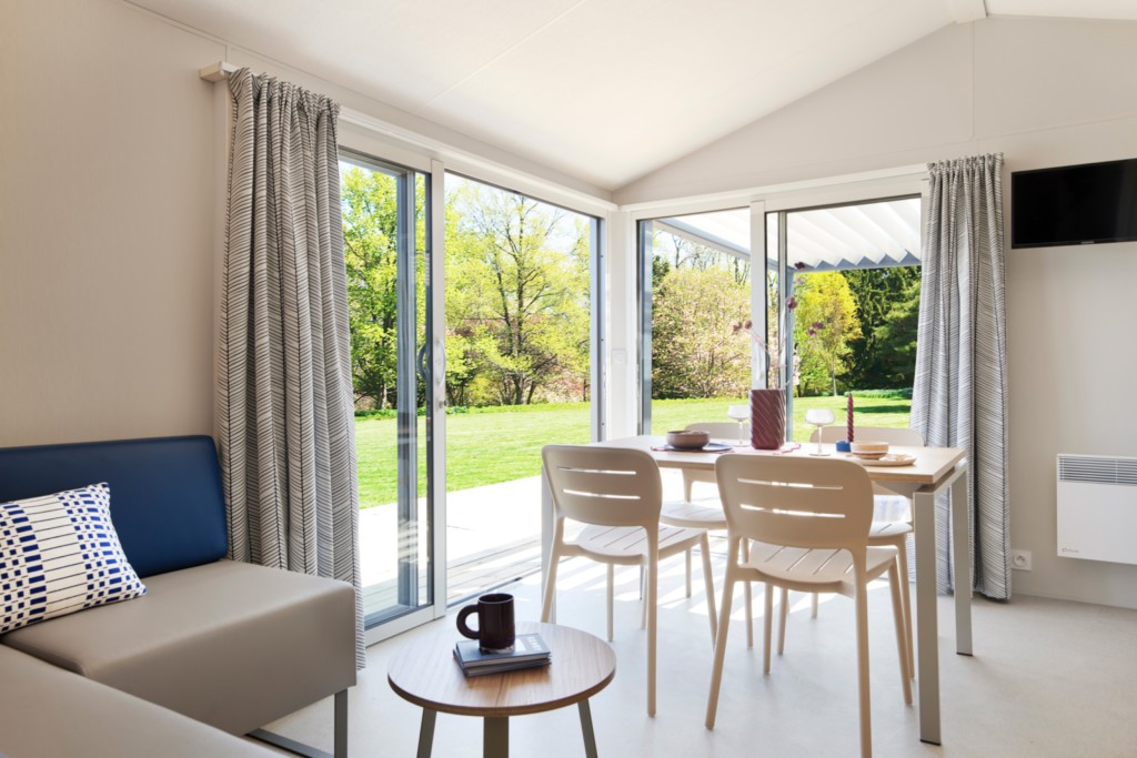 Le bergame 76.2 est un modèle lumineux ouvert sur la nature. Ici, l’angle de la pièce de vie est formé de 2 grandes baies vitrées avec un salon qui s’ouvre largement sur la terrasse et laisse entrer pleinement la lumière. Les menuiseries, déclinées dans une teinte inédite ''gris-bronze'', ajoutent une touche déco aux finitions. Son implantation suit les codes de la véranda pour offrir des moments de vacances pleinement ouverts sur l’extérieur. Le bergame 76.2 comporte une belle cuisine avec un séjour et un coin repas ergonomiques et de multiples rangements à portée de main.