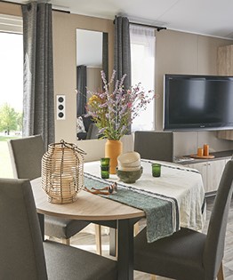 Extrêmement lumineux du fait de sa double baie en coin, l’ensemble cuisine-salon de l’ANKARA duo est sans conteste un point fort tant il s’apparente aux codes de l’habitat. Ici tout est «comme à la maison» : canapé moelleux, nouveau meuble TV de grande capacité, table basse, claustra déco, etc.